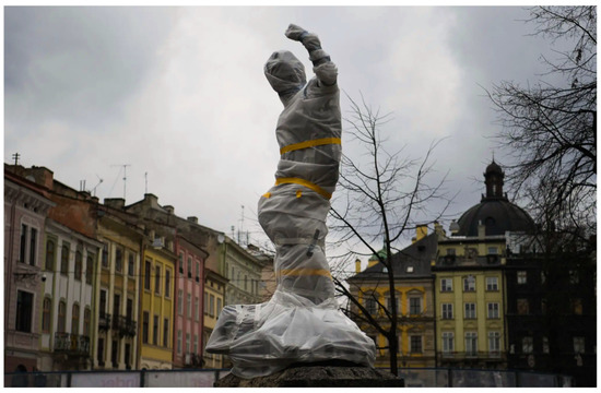 In Lviv, and elsewhere in Ukraine, many statues have been wrapped in plastic and other forms of insulation aimed at their protection from war. Re-elaborated from Daniel Leal/Agence France Presse-Getty Images.