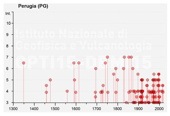 Intensity of the earthquakes of the last centuries concerning the area of Perugia (Mercalli scale on the vertical axis). Taken from the CPTI15 Parametric Catalogue of Italian Earthquakes 2015, INGV, Italy. www.ingv.it (accessed on 3 March 2021).