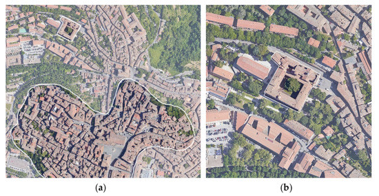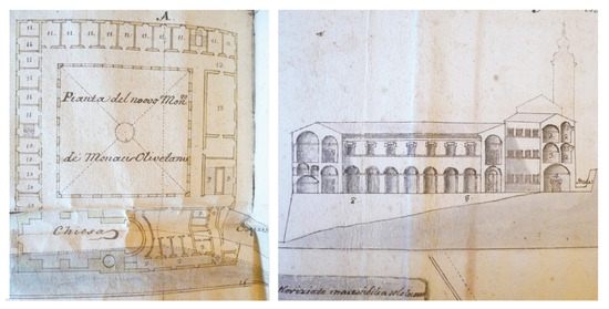 Located on the north-west side of the historical centre of the city of Perugia, the architectural complex of Palazzo Murena was designed by Luigi Vanvitelli in 1739 on commission of the religious order of the Olivetani for the transfer of their conventual seat, Monte Morcino Nuovo, near the medieval quarter of the Conca. In particular, the new monastic complex stood on the side of the district with the best exposure from the climatic point of view, the ancient contrada de’ Pasteni, which was as Vanvitelli declared in one of his memorial letters: “per esser grande e libero e suppongo arioso” in which “si potrà fare una chiesa molto onesta, la quale penserei di figura regolare con sua cuppola o catino sopra […] chiostro […] bello e spatioso” [9]. The territory, characterized for several centuries by alternating agricultural land and burial grounds, showed the first signs of settlement at the end of the thirteenth century [10]. Nevertheless, the peculiar topography of the place and its strategic location, close to the historical centre of the city, revealed its aptitude to host the monastery complex (Figure 3). The architecture is configured, from a typological perspective, as a fortification with a quadrangular base and a central courtyard constituted as follows: to the north, by the linear building of the Olivetan church, designed by Vanvitelli himself in 1739 and in which the main traits of the architect’s classical conception stand out; to the south, by the “U” shaped building of the Olivetan monastery with more austere and rigid characters (as the multiple and regular openings in the facades betray), also designed by Vanvitelli but completed by his pupil Carlo Murena from whom it inherited its current name [11] (p. 196) [12,13] (p. 36).