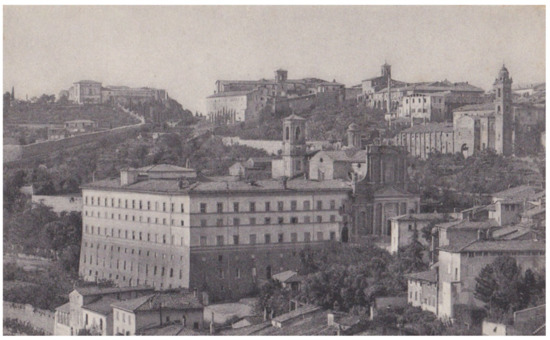 Such architectural magnificence, on the other hand, did not escape bad judgments in its time. The local historian Luigi Bonazzi severely criticized the new architectural complex defining it “una specie di Alhambra” and encouraged its permanence only because in 1810, following the Napoleonic suppression of the monastic orders, it was subtracted to the order of the Olivetani and attributed to the University of Perugia [15] that chose it as the ideal place to transfer its own seat: “la sua forma elegante, la sua località lontano da ogni rumore che rendono le città popolose, lo rende preferibile ad ogni altro locale” [9]. In 1824, indeed, with the Regulation of studies issued by Leo XII, the University of Perugia became state-owned and subsequently, in 1860, the property of the entire architectural complex passed to the Italian state property allowing the conversion of the complex to the headquarters of the Rectorate and the administrative offices of the University of Perugia. In this way the foundations were laid for the intense building program promoted later, between the 1960s and 1970s, by the rector Giuseppe Ermini in synergy with the architect Giuseppe Nicolosi [16], whose work supplanted the pre-existing green areas and transformed the Conca area into a real university campus [17].