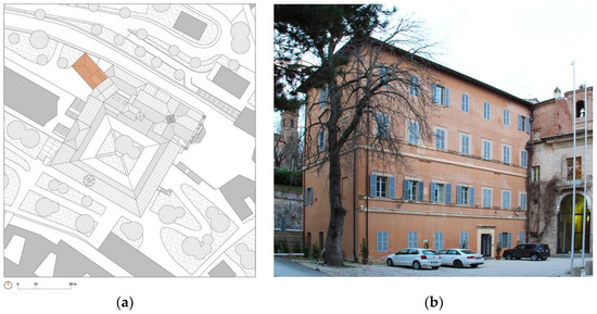 On the left, (a) planimetry of the architectural complex of Palazzo Murena, the centre of the Bursar office of the University of the Studies of Perugia is highlighted in orange; on the right, (b) photo of the centre of the Bursar office of the University of the Studies of Perugia.