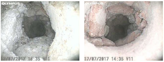 Extract of in situ investigations [21]. In particular, photographs of videoendoscopy V11—from intrados. On the left, view at 15 cm from the start of the drill, filling in unbound material; on the right, image at 10 cm from the start revealing of the drill, brick and mortar elements.