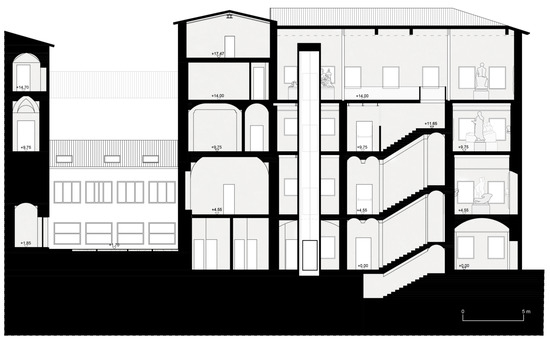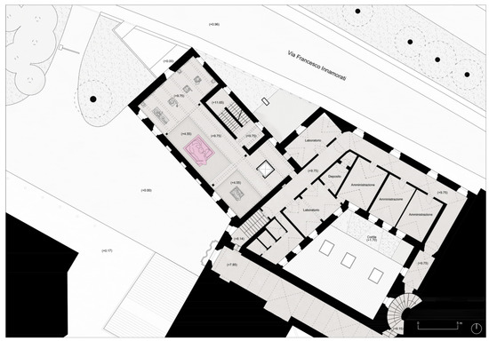 The exceptionality of this building, with a linear development, is manifested both in its dissonant position with respect to the planimetric layout of the complex, justified by the change made by Vanvitelli to the original road network, and in the different and varied partitioning of the internal spaces, referable to the different destination of use assumed over time. Nevertheless, in the autograph drawings of the architect for the project of the monastery, preserved in the State Archives of Perugia (Tarducci M., Evoluzione storica e stratigrafica di Palazzo Murena, research conducted as part of the teaching of “Architettura e Composizione 1” of the Degree Course in Building Engineering and Architecture, held by Professor Paolo Belardi, a.a. 2016/2017, Archives of the Department of Civil and Environmental Engineering of the University of Perugia), such a building has been depicted in gray and marked by the expression ospizio, revealing both the antecedence with respect to the project and its primitive function. In addition, Vanvitelli’s design choice to incorporate it into the monastic complex, rather than proceed with its demolition, supports the hypothesis regarding the architectural value of the building itself, which still boasts the presence of vaulted rooms. From the analysis of the drawings, it was also possible to see how the building was originally perched along a naturalistic slope, the remodelling of which necessarily led to the erection of a retaining wall (in order to “tenere il terreno tagliato” belonging to the above field of the San Benedetto’s nuns). Moreover, the actual fourth plan represents the result of a more recent elevation (the building originally being constructed on three floors) (Figure 6). At the same time, the consultation of the yearbooks of the University of Perugia, has allowed the reconstruction of the multiple functions that the building hosted over time and that brought the uncontrollable partition of the internal spaces. In fact, after the original intended use as a hospice for the religious and before becoming the headquarters of the Bursar office of the University of Perugia, the spaces were used as the seat of the Institute of Physics, of the Accounting Office of the University of Perugia and of the Command Station of the Carabinieri.