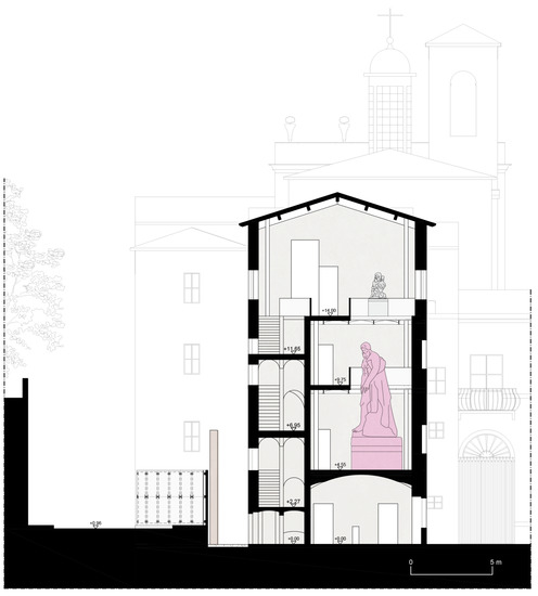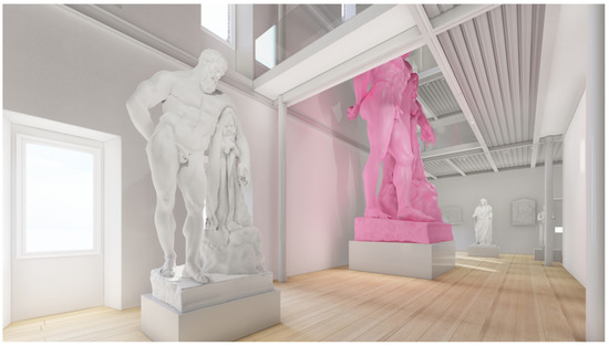 In this way the project, forging a precise and inedited architectural character, allows a continuous dynamism of the spaces that can be adapted from time to time to the various curatorial needs. This strategy also guarantees the prefiguration of a next-generation museum structure dedicated to interactions with visitors and students through the university practice of life drawing [31]. The museum complex, directly accessible from the gardens of Palazzo Murena, is distributed in part on the levels of the building that housed the headquarters of the Bursar office and in part within the adjacent rooms, belonging to Palazzo Murena and, in the project prospective, intended for classrooms and teaching laboratories. From the reception, placed at the ground floor, thanks to the pre-existing core of vertical connections and to the insertion of the elevator that improves accessibility, it is possible to access the exhibition spaces located on the upper floors hosting the collection of plaster casts of the University of Perugia. Pieces of the collection are arranged both along the walls and in the centre of the rooms, and many sculptures have been placed on mobile bases to allow for different placements on the basis of different needs. The exhibition criteria privileged a distribution that aimed at the figurative exceptionality and at the dimensional comparison of copies and reproductions, as can be seen from the inclusion of the statue of Ercole Farnese in its different variants: the original plaster cast preserved at the Academy of Fine Arts “Pietro Vannucci”, and a colossal and spectacular plastic replica of the same produced through 3D printing and marked by a programmatically provocative chromatic finish. In this sense, the statues act as a scenic catalyst for the entire museum composition. Placed in spaces of double and triple height, the art goods accompany the visitor in the exhibition ensuring, at the same time, their maximum visibility through multiple and unusual points of view. In this way, the plaster collection responds at the same time to contemporary exhibition and conservation requirements and, above all, to the need for education activities, becoming, both formally and substantially, a new cultural centre for the university and the city (Figure 12 and Figure 13).