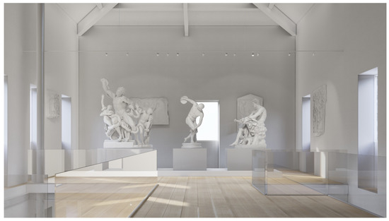 Although the oldest evidence of plaster casts that have come down to us, produced mostly from bronze and marble originals, attest to the widespread practice of copying since the classical era (just think of the important discovery of casts from the Roman era in Baia) [4] with both educational purposes, as in Athens, and decorative, as in Rome, the plaster cast gallery—intended as a teaching laboratory designated to the knowledge of the ancient, the artistic exercise and the study of statues—was established only in the Renaissance period [5]. In fact, the first collections of plaster casts could be found in the workshops of the wealthiest artisans and in the artists’ ateliers rather than in the royal courts. Only after the formation of the first Academies of Drawing (Florence in 1562, Perugia in 1573 and Rome in 1577) these sculptures begun to be conserved in special rooms called Sala dei Gessi or Sala delle Statue, later identified as plaster cast galleries [5]. Between the eighteenth and nineteenth centuries, the undisputed protagonist of the proliferation of plaster cast galleries in Italy was Antonio Canova who, as minister plenipotentiary of Pope Pius VII, contributed in particular to the growth of the collections of the academies in the papal territory, orienting trends in the relative spheres of influence. Canova, as choral director of the plaster casts galleries, had a decisive influence on their teaching role, so much so that his cultural policy spread to Umbria (an Italian region that the sculptor frequented assiduously as the owner of a summer residence in Sangemini) and in particular to Perugia, where he was a member emeritus of the Academy of Fine Arts [6]. It is no coincidence that even today, among the boasts of the Umbrian capital, from a historical and cultural perspective, the three collections owned by the main institutes of high education occupy an eminent position: Academy of Fine Arts “Pietro Vannucci”, University for Foreigners, University of Perugia. In addition to the two plaster cast galleries set up in the former convent of San Francesco al Prato and in palazzo Pontani they represent a significant historical-artistic heritage. Respectively, in the former convent of San Francesco al Prato is preserved the collection of the Academy (grown in number, over the centuries, from the four Michelangelo casts imported by Vincenzo Danti) [7] and in palazzo Pontani the collection of the University of Perugia (formed from an initial nucleus of a few Greco-Roman units and organized as a scientific cabinet by the Etruscologist Filippo Magi between 1960 and 1975), is kept [8]. However, although the plaster casts gallery of the “Pietro Vannucci” Academy of Fine Arts was renovated according to the project of the architect Fabio Mongelli following the structural lesions caused by the disastrous earthquake of 1997, the plaster casts gallery of the University of Perugia, despite hosting works that have recently undergone a meticulous intervention of restoration, does not yet present an iconic exhibition environment at the height of the patrimonial value of the collection itself. This is both due to the difficult accessibility and the small size of the current spaces that prevent an adequate museal set-up.