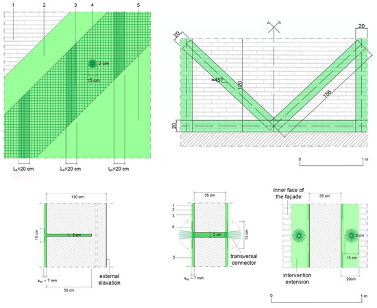 In particular, concerning the interventions on the inner face of the external walls, a widespread application of FRCM is proposed, the designed plan also includes the use of transversal connectors—one for each five square meter of wall—made of the same natural material of the nets. A similar intervention concerns the in falso walls observed in the building but, at this juncture, a different application criterion for both walls’ faces is proposed (Figure 16). Indeed, for such wall facings a peculiar application scheme based on an applied research work of the authors—called “Green tape” and awarded in 2022 by the Italian Association of Composite Materials—was designed [45]. Within this approach a knitted scheme is adopted through tapes of composite, each one less than 1 cm thick and 20 cm wide, applied only on the weakest walls’ areas. So, still guaranteeing the walls’ reinforcement and knock-on effects prevention, a smaller amount of composites is used than that in the canonical application (distributed on the whole wall as in the case of the inner faces of the outer masonries).