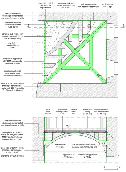 Moreover, the interventions—along with other precautions—are designed to be anchored through connectors on the vertical borders of the lateral masonries (Figure 17).