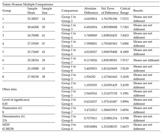Tukey–Kramer test results for the four groups of cities.