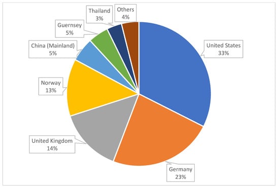 The study took the economic performance of 45 companies with renewable energy as their core business to analyze the data. These companies are located around the world. The selection of companies was based on sufficient data to confirm the author’s hypothesis. Figure 1 shows the proportion of locations around the world of some of the companies taken for analysis. The chart shows that the largest number of companies is concentrated in the United States, namely 33%.