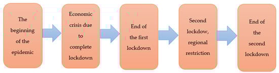 The World Health Organization declared a pandemic on 12 March 2020, causing many people to move to remote work []. This decision led to an improvement in the spread of coronavirus infection, but it contributed to an economic crisis that affected all sectors of the economy [,].