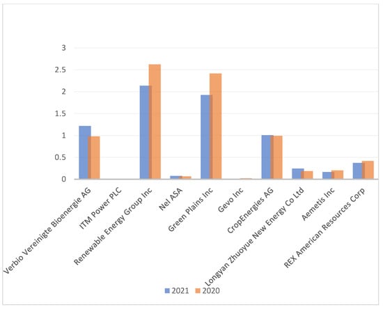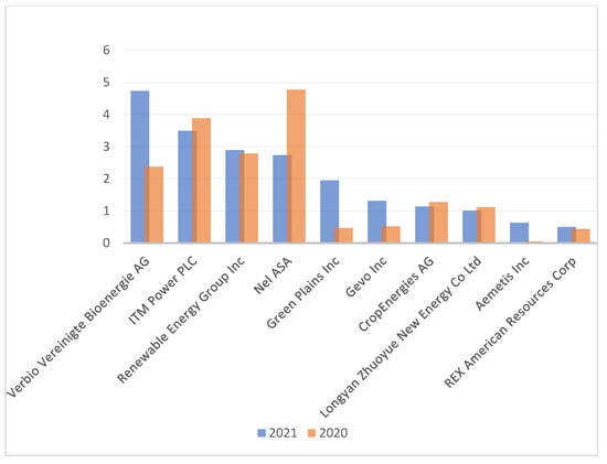 Figure 3 illustrates the change in companies’ revenue for 2020 and 2021. The chart shows an increase in profitability for four of the top 10 companies, but a full analysis of 45 companies shows a significant increase in their earnings. On average, the profitability of all 45 companies analyzed increased by 60%, but the methods section calculated a measure such as covariance, whose coefficient is negative, indicating that in this situation, when companies’ capitalization increases, their revenue decreases. This proves that during the pandemic, the crisis caught the renewable energy industry through a reduced workforce and a negative economic situation around the world, but the demand for this resource has increased, as many studies prove that renewable energy is economically more attractive.
