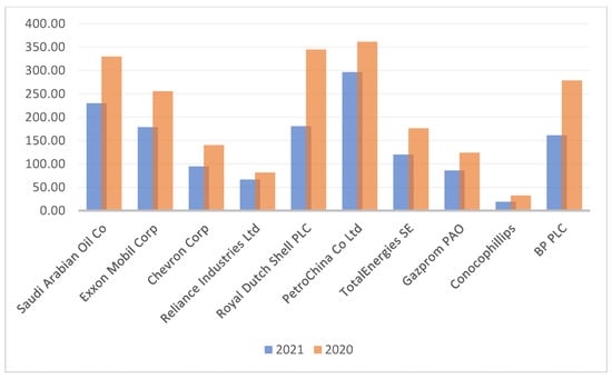 Comparison of revenues of the 10 largest fossil energy companies by capitalization in 2020 and 2021, mln. USD. Source: authors’ calculations.