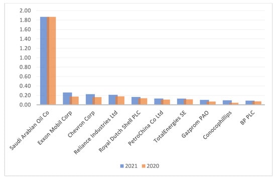 Comparison capitalizations of the 10 largest fossil energy companies by capitalization in 2020 and 2021, trln. USD. Source: authors’ calculations.