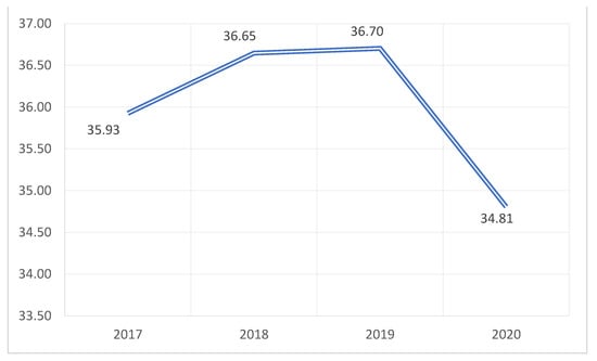 Figure 8 shows the annual production carbon dioxide emissions. The graph is based on territorial emissions, and it does not consider emissions related to traded goods. We can see from the chart that the CO2 emissions fell during the coronavirus infection and pandemic, which caused many firms to close, and this has had an impact on air pollution. The time interval taken by the authors for the analysis allows us to clearly trace the situation of CO2 emissions during the pandemic.