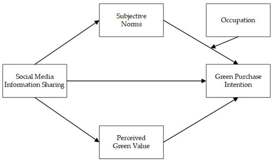 Basic information such as occupation is also a factor that influences consumer behavior and market segmentation [71]. Customers in different occupations have different lifestyles, values, needs, and preferences due to their different environments and groups, which can have a direct impact on purchasing behavior [72]. At the same time, most customers’ involvement and purchasing behavior are influenced by relevant groups with varying degrees of influence [73]. According to previous studies, social influence is one of the main reasons why consumers buy green products [69,70]. When making product decisions or choosing a brand, consumers intentionally meet the expectations of their group to gain their group’s approval, and, in this case, the reference group has a normative influence on the consumer [74]. Social media information sharing is “circle-based” [44]; while non-student consumers are influenced by work, they have more regular social circles, more frequent social activities, and more complex social relationships compared with students without a formal occupation. Thus, they pay more attention to their image in the social circle, and are more likely to feel the normative influence from the “circle”. At the same time, green products tend to be more expensive than average due to their green attributes [75]. Some consumers have stereotypical perceptions of green products as being of low utility, lacking functionality, and having high prices [76,77]. As a result, this discourages the public’s willingness to pay for green product premiums. However, when the green product premium conveys the public’s pro-social signaling characteristics and can help individuals project a good external image, it can effectively increase the public’s acceptance of the green product premium [78]. As non-student consumers have relatively stable income, they also have a higher ability to pay for the products. More importantly, compared to the student group, the non-student group is more sensitive to the perception of social image and social status [79], and the purchase and use of green products caters exactly to their strong demand for social status. Therefore, the subjective norms and purchase intentions of green products generated by customers’ social media information sharing vary by occupation. Therefore, this study proposes the following hypothesis to examine the moderating effect of occupation differences.