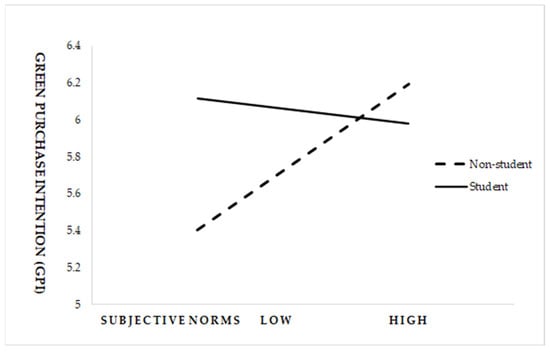 To further test Hypothesis 8, the results of the bootstrap method [84] based on 5000 replicate samples are shown on the left-hand side of Table 10, where the confidence interval contains zero (CI = (−0.009, 0.187) when the consumer is a student, and the conditional mediating effect is not significant. The possible reason is that the social role of consumers who are students is relatively simple, and the social scope is relatively small, so the demand for social recognition and improving their social acceptance is lower than that of non-student consumers. In addition, the student population has no formal income and is less able to pay a premium for green products. The mediating effect of SN on the moderated GPI was more significant when consumers were non-students by profession (b = 0.353, 95% CI = (0.259, 0.462), p < 0.001). For a visual interpretation of the moderation effect, the results were plotted (as shown in Figure 2).