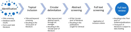 An additional delimitation was subsequently performed on the gross pool of literature, singling out all references addressing the term ‘circular’ explicitly. This step was performed for the content of the review to be comprehensible, enabling practical handling of the scope of the review. This delimiting step is included in the review halfway through instead of at the starting point in order to map out some initial tendencies in the gross pool of literature. By further applying a criterion for the papers to contain ‘circular’, the gross pool of papers was reduced to the ‘circular pool’ of literature, which were subject to an abstract screening. All papers screened on abstracts were included in a separate excel sheet, noting the reason for exclusion. The publications included from abstract screening were subject to being sought for retrieval.