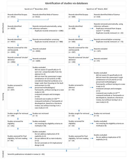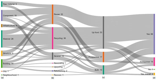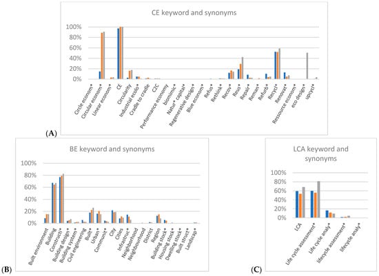 Throughout the search string iterations, leading up to the strings in Table 1, some keyword synonyms were revised, as they were found to skew the pool of results, and therefore they were excluded in the final search strings presented in Table 1. In particular, the use of CE R-imperative ‘Reduce’ can be highlighted, which is a word commonly used in the assessment of environmental impacts. Another is ‘industrial symbiosis’ (IS), as this is often not directly related to the BE but has a broader scope, though it is interesting in the greater scope. An interesting study, which included IS in its review but did not consider the BE and construction, as these are seen as specialist topics, is Harris et al. (2021) []. They reviewed the most recent literature within CE and assessment of environmental implications, dividing systems at micro (product), meso (industrial), and macro (national or city) level, finding that few studies link the impacts between levels (e.g., product and societal consequences) [].