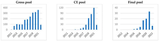 This step is performed in order to assess overall but pseudo tendencies in the pool of studies, compared to the final pool of included studies. The inclusion overview is intended to give a perspective between the final included studies relative to the gross pool and circular pool of literature which was screened throughout the scoping review. From Figure 4, it is seen that the temporal trend of publication changes. Looking at the left hand figure, which covers 2046 titles, but also a broader scope of keywords surrounding CE (cf. Table 2), the number of published papers is already prominent in 2012, whereas, when limiting the focus to studies containing ‘circular’ specifically (middle diagram), this number is reduced considerably, and the publications are found to start taking off in 2016. Looking at the right-hand figure, considering only the final pool of included studies (85 titles), a similar trend to the ‘circular’ is found, with an increasing amount of papers since 2016. This is in line with previous finding in e.g., [].