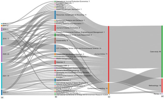 Hossain & Ng (2018) [] performed a review of LCA performed on buildings, covering surveys, reviews, and case studies, demonstrating research gaps for comprehensive building assessments. In addition to the review, they propose a framework for assessing CE implications, focusing on the little-covered aspects of resource-efficient buildings and resource recovery []. Lovrenčić Butković et al. (2021) [] looked into the tools and assessment methods used for evaluating CE in the construction industry, aiming to categorize CE concepts and tools used for assessments. They found, like other studies, that the number of environmental performance assessment studies is increasing, and that the most frequently applied assessment tool is LCA, along with the most often assessed life cycle stage being waste management [].