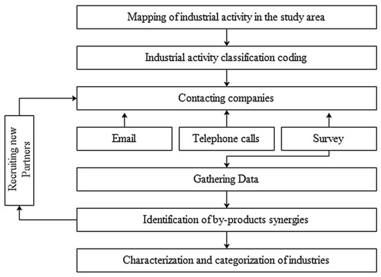 The assessment tool is composed of four primary steps: (1) a survey of the industrial area, (2) a classification of industrial activity, (3) data collection, and finally (4) an identification of synergies and potential barriers for industrial symbiosis. The adopted methodological framework is a pragmatic, reliable and robust approach for deciphering intricacies in industrial linkages [30,31,32]. It deftly contributed to a comprehension of the symbiotic connections among the industrial entities in the study area. The schematic representation (Figure 1) elucidates the methodological framework, while subsequent sections further elaborate on the methodological process followed in this study.