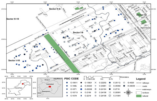 The industrial activities were classified in accordance with the Pakistan Standard Industrial Classification (For All Economic Activities) (PSIC) Code of 2010 (http://www.pbs.gov.pk/sites/default/files/other/PSIC_2010.pdf/, accessed on 16 September 2019), see Appendix A. For this purpose, the information regarding the industrial units located in the study area were retrieved from ICCI and Pak-EPA. The list was organized according to the PSIC classification scheme. The PSIC code-based mechanism is a set of internationally agreed classification rules based on economics and industrial activities [37,38]. It offers a robust framework for assessing and reporting industrial activities [10]. It is considered a suitable framework for such investigations in Pakistan [38]. The probe concluded that the classification of industrial activities is a challenging task in newly industrializing regions. Several field visits were conducted to the area, for verification of data and rapport building. During these initial survey visits, limited information pertaining to the nature of production, number of employees, contact details and certification status, along with geographical location was collected and compiled to make an inventory of the industrial activities. This information was then used for developing a map of the region using Geographic Information System (GIS) (ArcGIS software Version 10.3. Redlands, CA, USA: Environmental Systems Research Institute) for spatial/temporal assessments, see Figure 2. This approach for field investigation yielded the following advantages as it (1) enabled interaction with the respondents in an informal way; (2) provided an opportunity to scrutinize the contextual potentials and challenges for assessments; (3) collected insights from the stakeholders which helped to develop a conclusive survey booklet for data collection.