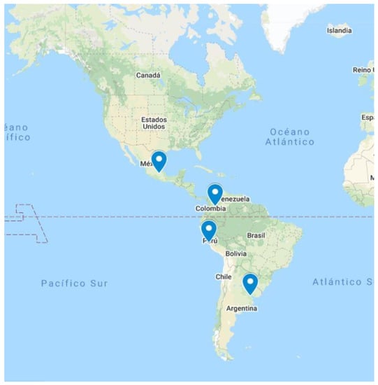 The study was carried out in the four largest Spanish-speaking cities of Latin America. Figure 1 shows the location of each of the studied cities (Google Maps, Google, Mountain View, CA, USA), and Table 1 shows the population in each metropolitan area [70] of the four cities that are examined in this research: Mexico City, Lima, Bogota, and Buenos Aires are among the cities with the largest populations in Latin America.