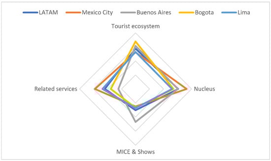Once the region as a whole had been studied, how each city behaved in terms of these factors was also studied (RQ2). It was discovered that Bogota was the leader in terms of tourist ecosystem, while Mexico City predominated in terms of the nucleus. Buenos Aires appeared to be the most appreciated in terms of MICE and shows, and in related services, Mexico City again performed the best. Lima did not predominate in any of the factors but was close to the regional average.