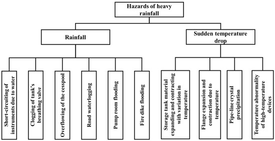 The vulnerability analyses of coastal oil depots should be based on specific heavy rainfall disasters, which are often accompanied by sudden cooling. The disasters caused in oil depots following heavy rainfall as shown in Figure 1 include (1) short-circuiting of instruments due to water, (2) clogging of tank’s breathing valve, (3) overflowing of the cesspool, (4) road waterlogging, (5) pump room flooding, (6) fire dike flooding, (7) storage tank material expanding and contracting with temperature variation, (8) flange expansion and contraction due to temperature, (9) pipe-line crystal precipitation, and (10) temperature abnormality of high-temperature devices.