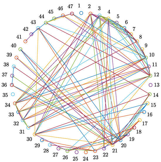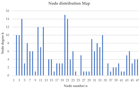 According to the node relation data provided by the adjacency matrix, we established a complex network using MATLAB R2018a (Figure 4) and obtained the distribution diagram of the node degree (Figure 5).
