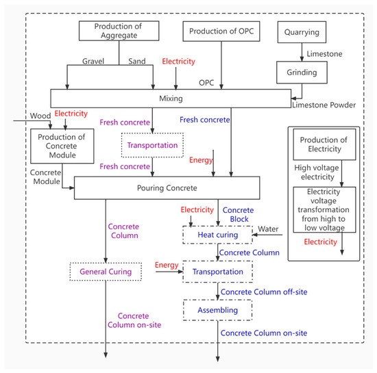 The processes and flows highlighted in purple (Figure 2) represent the production process for the on-site construction method. While the processes and flows highlighted in blue (Figure 2) are the processes for the off-site construction method. CEM II 42.5 N based on limestone filler was used to produce TC. The differences are mainly in the curing methods and the time of transportation. For the on-site construction method, the mixed concrete will be transported to the construction site and pouring concrete elements on-site. For the off-site method, this process is finished in the factory, and after concrete elements are cured and meet the requirements, the elements will be transported to the construction site. Other processes and flows in black are the common processes needed for both on-site and off-site methods.