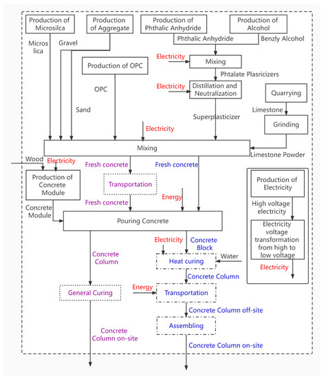 This is a partial LCA study, which only considers the impacts of the production of columns, i.e., a cradle to site research. Figure 2 illustrates the flow chart for the production of traditional concrete (TC). The flow chart shows the unit process, input, and output considered in this study. The products such as aggregate, sand, and Ordinary Portland Cement (OPC), are intermediate flows in the LCA study. The intermediate flow highlighted in red is low voltage electricity, and it is generated by the production of electricity and transformation from high voltage electricity to low voltage. Because low electricity is a resource required in many processes, to simplify the flow chart, the author used separate product electricity to represent low voltage electricity in the flow chart.