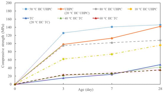 The mix design and strength of heat curing TC are obtained from Topçu and Toprak [14], which is cured at 20 °C, 40 °C, and 60 °C. The data for concrete produced by the CO2 curing method is collected from Monkman and MacDonald [15]. According to the America Concrete Institute (ACI) Committee 301, a minimum curing period corresponds to concrete attaining 70% of the specified compressive strength [20]. Thus, this study also obtained the LCA results designed on the 70% compressive strength of UHPC and TC. The compressive strength development method was determined by Kim et al. [21], and the compressive strength development for different curing conditions used in this study is shown in Figure 4.