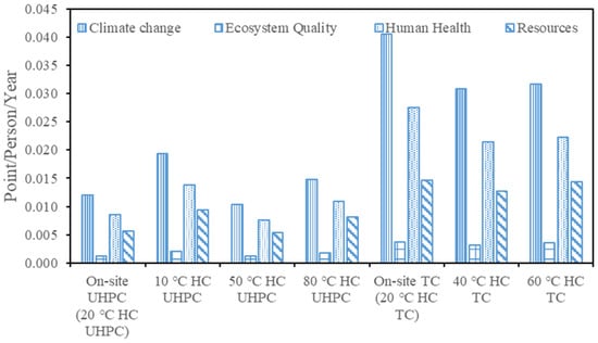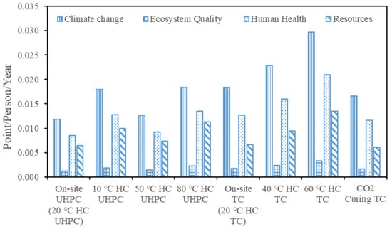 The results showed that the on-site UHPC system has the lowest environmental impacts on four categories among eight groups (Figure 5). The system with the highest environmental impact is off-site 60 °C HC TC. Climate change is the most important impact that needs to be considered, whose environmental burden can reach 0.0297 point/person/year in 60 °C HC TC. For the off-site heat curing (HC) method for both UHPC and TC, the impact value obtained for HC are higher than the on-site method. For TC curing at all temperatures, the 28-day strength was lower than that of on-site curing. The water bath heat curing not only consumes additional energy but also reduces strength and requires more materials—all of these reasons lead to a higher environmental impact of HC TC. As for UHPC, the reason was similar, only UHPC curing at 50 °C has a slightly higher strength; therefore, it has a similar impact to on-site UHPC, which is the second-lowest impact among these eight systems. This condition could be regarded as a potential method to be modified for industry application. Comparing these four impact categories, climate change is the major impact category contributor to the total impacts in all systems, the influence of human health and resources is the second and third important impact category, while the ecosystem quality is the lowest contribution to the total impacts.