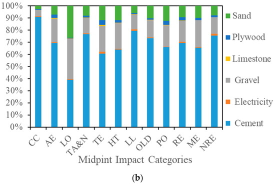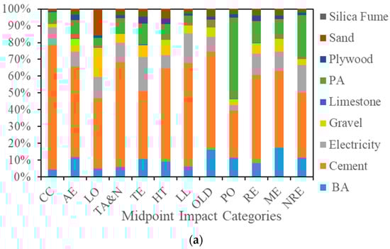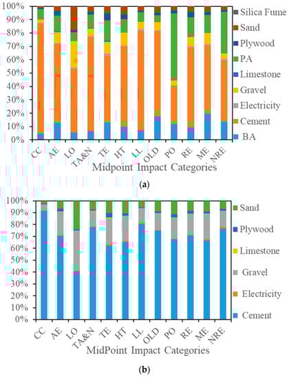 Contribution analysis for (a) UHPC and (b) TC (CC: Climate Change; AE: Aquatic Ecotoxicity; LO: Land Occupation; TA&N: Terrestrial Acidification and Nutrification; TE: Terrestrial Ecotoxicity; HT: Human Toxicity; LL: Lonising Ladiation; OLD: Ozone Layer Depletion; PO: Photochemical Oxidation; RE: Respiratory Effects; ME: Mineral Extraction; NRE: Non-renewable Energy; PA: Phthalic Anhydride; BA: Benzyl Alcohol).