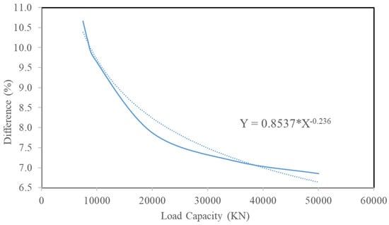 Difference between 50 °C HC and general off-site UHPC as a function of the load capacity.