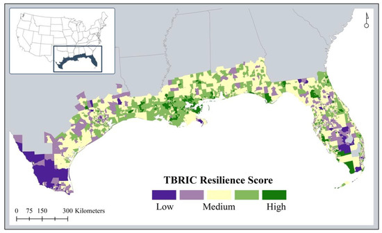 The Gulf Coast region extending from South Texas to Florida serves as the testbed for the TBRIC implementation in this study. Given the similarities in hazard experiences in the past two decades with repeated land-falling tropical storms and flooding in both urban and rural locations, significant property and crop losses, and demographic changes, this region has been ground zero for understanding the variability in resilience capacity. The authors also have considerable field experience working in this region [31], understanding resilience-focused longitudinal datasets covering the region [32], and participating in collaborative projects sponsored by the Gulf Research Program of the United States’ National Academies of Science, Engineering, and Medicine (NASEM).