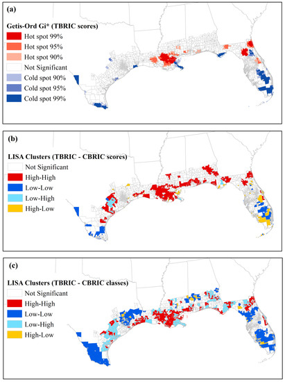 (a) Optimized hot spot analysis using the Getis-Ord Gi* Statistics for TBRIC scores; (b) Bivariate local Moran’s I for TBRIC and CBRIC scores; and (c) Bivariate local Moran’s I for TBRIC and CBRIC classes.