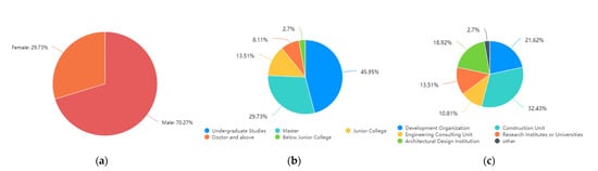(a) Proportion of male and female interviewees; (b) distribution of interviewees’ academic background; (c) type of interviewees’ employers.