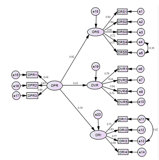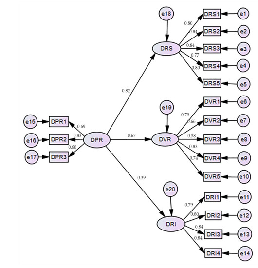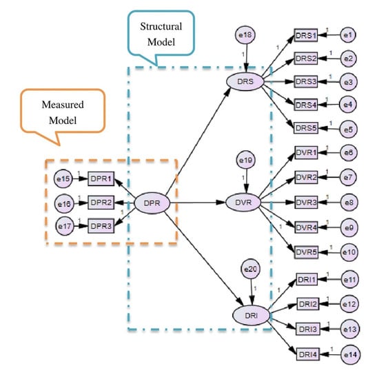 AMOS is used for parameter estimation, obtaining the standard path coefficient structure diagram of the initial structural equation with parameters. DPR, DRS, DVR, and DRI are latent variables; DPR1-DPR3, DRS1-DRS5, DVR1-DVR5, and DRI1-DRI4 are observed variables. Each observed variable has its own observation error, and each exogenous latent variable has its own measurement error, as shown in Figure 4.