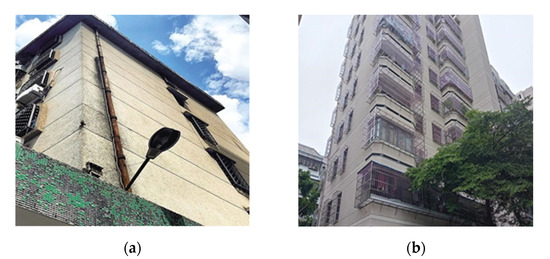 (a) Exterior walls of the dormitory community of Hainan Design and Research Institute Co., Ltd. before renovation. (b) Exterior walls of the dormitory community of Hainan Design and Research Institute Co., Ltd. after renovation.