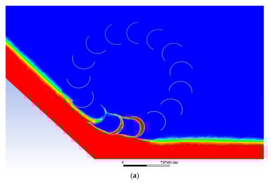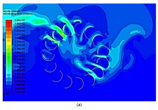 The visualization of velocity, pressure and volume fraction is important for analysis and better understanding of the results, especially the flow pattern (laminar, turbulent) can better be understood. In this study, the fluid domain is visualized for the straight channel for the C-shape blade profile at 144 RPM in terms of velocity, pressure and volume fraction contours as shown in Figure 14a–c, respectively. The fluid domain visualization for the inclined channel with a water conduit inclination angle 45° at the same RPM is shown in Figure 15a–c, respectively. The contours are shown for the mid-section plant of the waterwheel. The velocity and pressure values are higher for the inclined channel case compared to straight channel case.