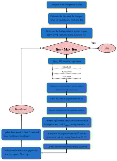 A hybrid optimization technique is a combination of two or more optimization algorithms. It aims to enhance the performance of the original algorithm. This could be executed by achieving a balance between exploration and exploitation, which prevents the original algorithm from being trapped into local optima [12]. GAEO is a new hybrid technique created by the authors of [32]. GAEO is a combination of two algorithms, a genetic algorithm (GA) and an equilibrium optimizer (EO). It has been successfully applied to optimize the size and location of distributed generators (DG) based on single and multi-objective functions [32].