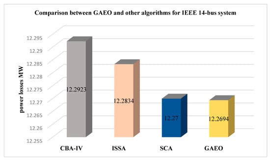 Applying GAEO to obtain ORPD while minimizing power losses is expected to be a milestone in judging our algorithm. As illustrated in Table 8, the chaotic bat algorithm (CBA) provided the best result so far at 21.9627 MW.