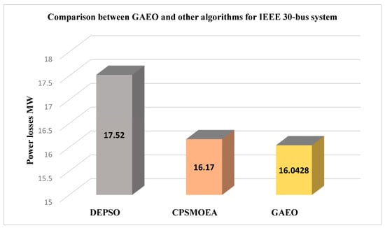Figure 4 illustrates a comparison between GAEO and other algorithms for the IEEE 30-bus system. As shown, GAEO has obtained the minimum value, 16.0428 MW, which is significantly more than CPSMOEA, which minimized power loss to 16.17. Finally, DEPSO comes last, with power loss equal to 17.52 MW.