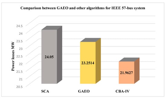 Figure 6 illustrates a comparison between GAEO and other algorithms based on power loss for IEEE57-bus system. Chaotic bat algorithm (CBA-IV) comes first with the minimum power loss, i.e., 21.9627 MW. GAEO comes second with active power losses of 23.2514 MW. Sine-cosine algorithm (SCA) comes last at 24.05 MW. GAEO has provided good results, but they were not superior CBA. This case shows that GAEO has a shortage when dealing with larger systems such as many other algorithms.