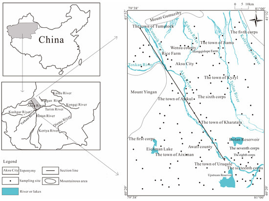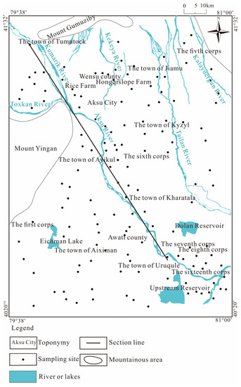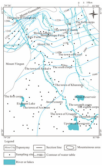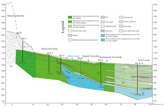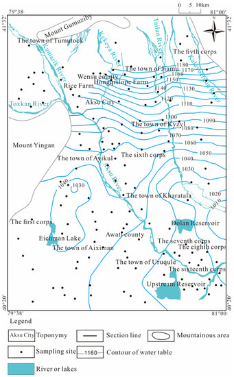 The Aksu River Basin is located at the southern foot of Tianshan Mountains and the northern edge of the Tarim Basin, which belongs to the first-level tectonic unit of the Tarim platform. The water system in this basin was formed from the end of the Tertiary to the beginning of the Quaternary. Due to the neotectonic movement of the northern mountain body, a downstream river system was formed along the south-dipping slope of the mountain body. The water flow has brought mountain debris to the front of the mountain and deposited it in the Awati fault depression, gradually forming the alluvial plain of the Aksu River and the Kekeya River. Additionally, the uplift of the Yingan Mountains has led to a decline of the southeast side of the study area, and the formation of a strip of lowland in Aiximan (Figure 1). With water accumulation, a bead-like lake group was generated. Meanwhile, the Aksu River continued to swing in periods and moved eastward to the current Laoda River and Xinda River, leaving several river traces in the west of the plain, which then evolved into an intermittent strip of an oxbow lake, as shown in Figure 1. The geomorphological units of the Aksu River Basin from north to south are the piedmont alluvial fan group, the alluvial–proluvial slope plain, and the fine-soil-grain plain. As shown in Figure 2, from north to south, the lithology changes from coarse to fine, and sandy gravel changes from medium-coarse sand, to fine sand, to sandy loam. The sloping gravel plain area in the piedmont zone is a single unconfined aquifer area. Its water is more than 50 m in depth with the deepest part being 220 m, and its thickness is 90–100 m. The gently sloping fine-soil plain area and the desert plain area are a multi-layer area with unconfined and confined aquifers. The unconfined aquifer of Tumuxiuke Town–Wensu-Jiamu Town, north of Wutuan is buried 10–50 m deep, and the middle and downstream of the unconfined aquifer of the alluvial plain is less than 10 m in depth. In the south of Ayikule Town, Rice Farm, and the south of Wutuan, groundwater overflows from an artesian well. The south and southeast are formed with confined aquifer rock groups (mainly sand layers), and the thickness of the confined aquifer gradually increases from the north to the south within 15–130 m. The confined aquifer winging out in the west of Aksu is influenced by the Yinganshan uplift. The groundwater flow in the unconfined aquifer and the confined aquifer in the Aksu River Basin is affected by this neotectonic movement, and flows from north to south. Its downstream flowing direction changes from north-to-south to south-to-east as shown in Figure 3 and Figure 4.
