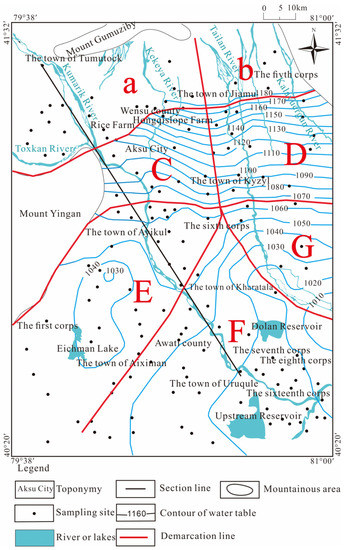 According to the above-mentioned assumptions and principles of the mixed-unit method, the unconfined aquifer of the Aksu River Basin was divided into seven small units (a, b, c, d, e, f, and g), and its confined aquifer is divided into five small units (C, D, E, F, and G), as shown in Figure 6.