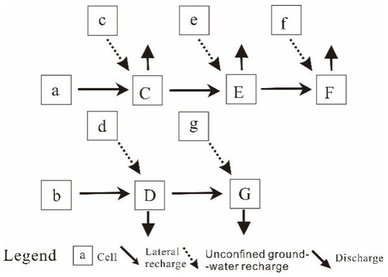 Because the studied area is located in the plain of alluvial–diluvial fine-soil particles, the conceptual model of the mixed units was established accordingly as shown in Figure 5. The mixed units of the unconfined aquifer and confined aquifer were, respectively, marked as a, b, c, d, e, f, and g and C, D, E, F, and G. Units a and b are located in the alluvial–proluvial slope gravel plain as a single-structure unconfined aquifer and are the recharging source of confined aquifer. All other units are in the alluvial–diluvial fine-soil-grain plain. Units G and F are discharging units. The transformation relationship between units of the aquifer is shown in Figure 7.