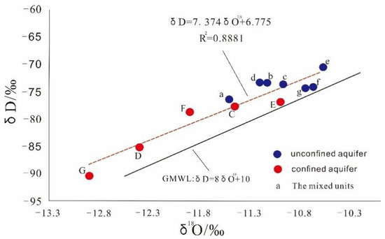 As shown in Figure 9, after the precipitation line slope of the aquifer of the studied area was compared with the Global Meteoric Water Line (GMWL) proposed by Craig [32], the slope and intercept were both smaller than the global precipitation line and δD and δ18O were all located at the upper left of GMWL. These results showed that strong evaporation had taken place in the whole of the aquifer.